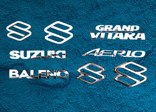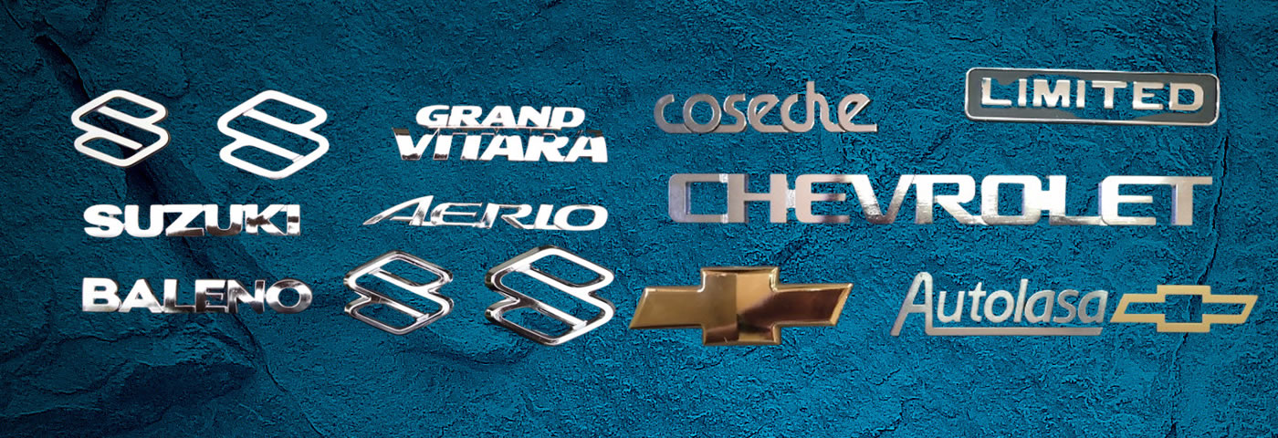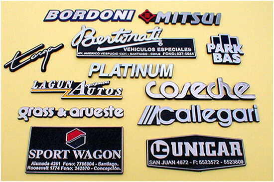 Nuestro productos cuentan con variados acabados superficiales, como son cromado sobre relieve, pintado o cromado electrolítico completo. Además, el diseño puede ser sobre fondo sólido, en negro o color, troquelado o letras “separadas”.
